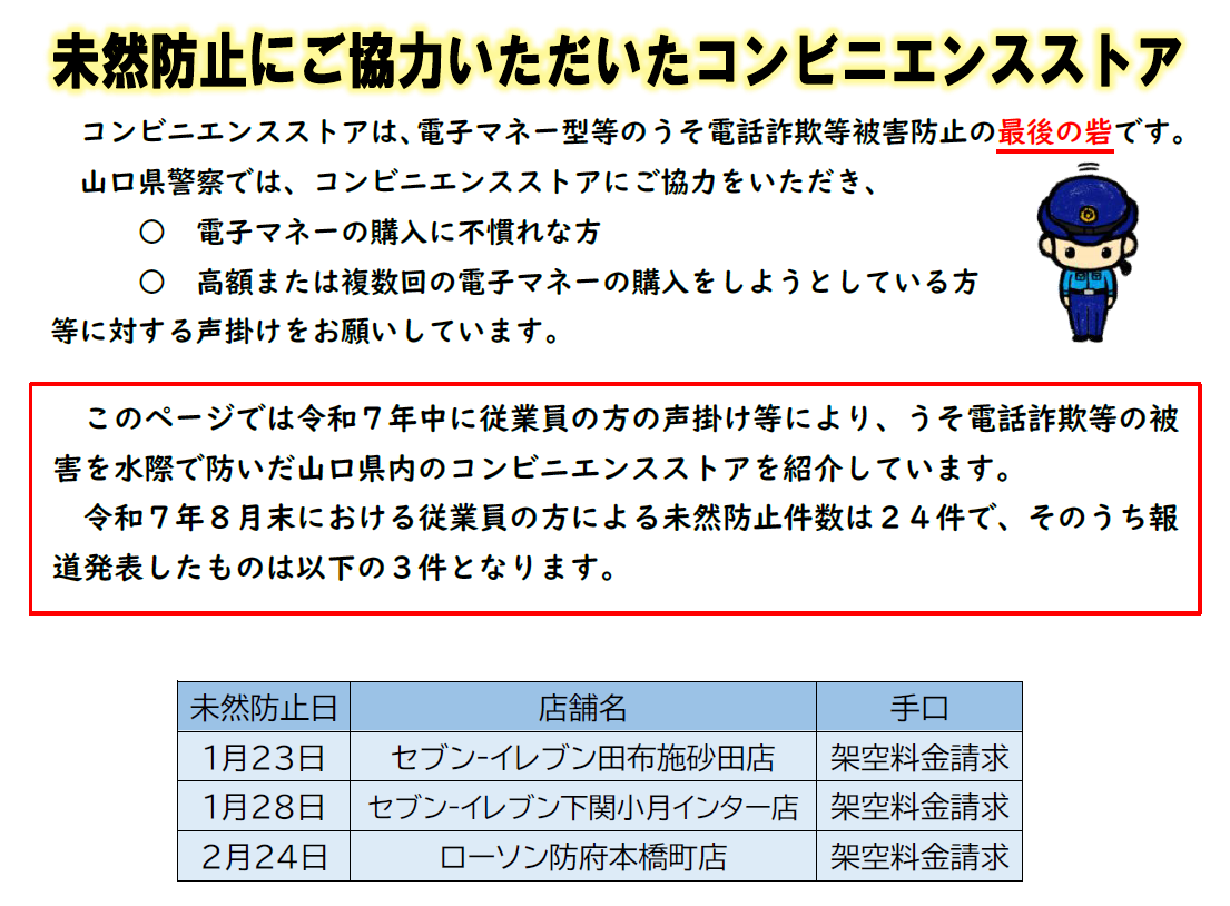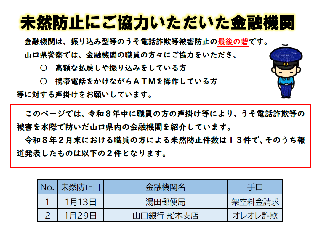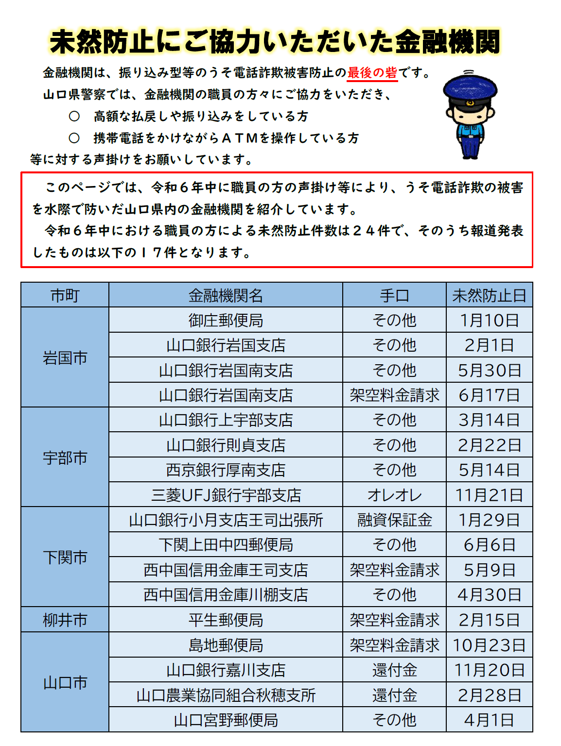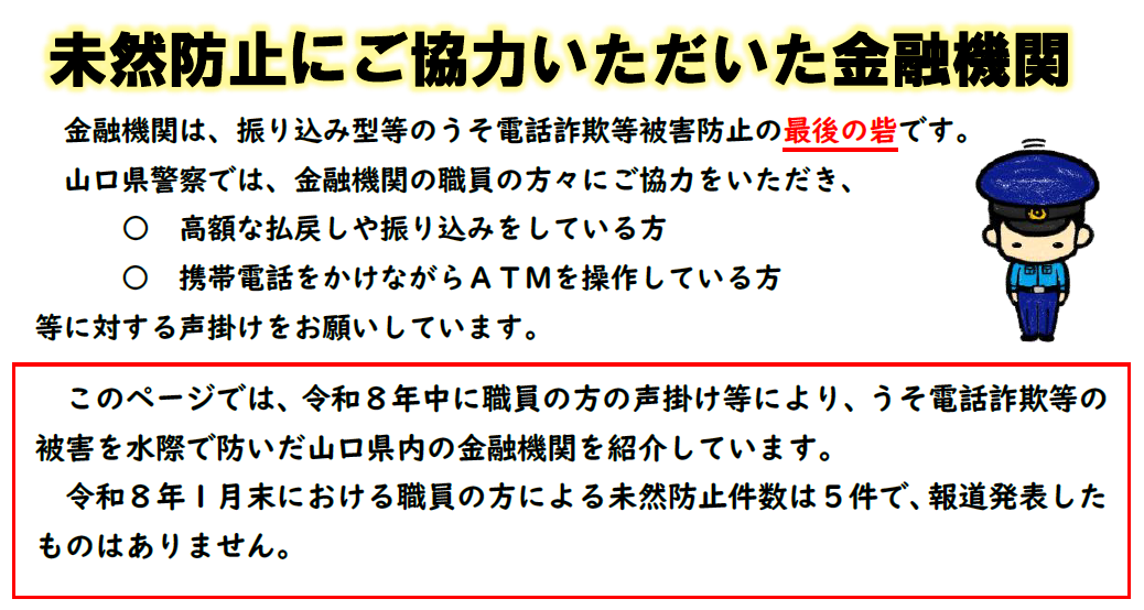 職員、従業員の方の声掛けなどにより、うそ電話詐欺の被害を水際で防いだ山口県内の金融機関、コンビニエンスストアを紹介しています。