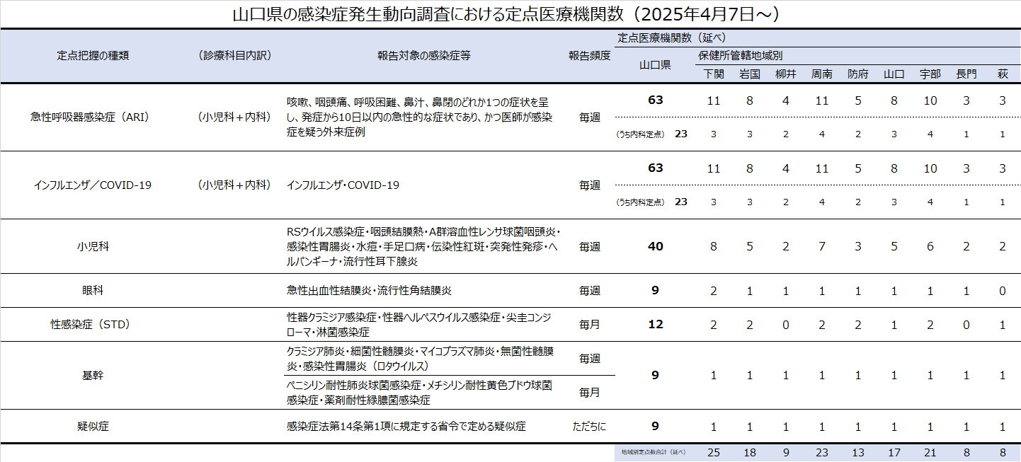 以下の表では、県が指定している定点医療機関数を定点把握の種類と保健所ごとに示しています。