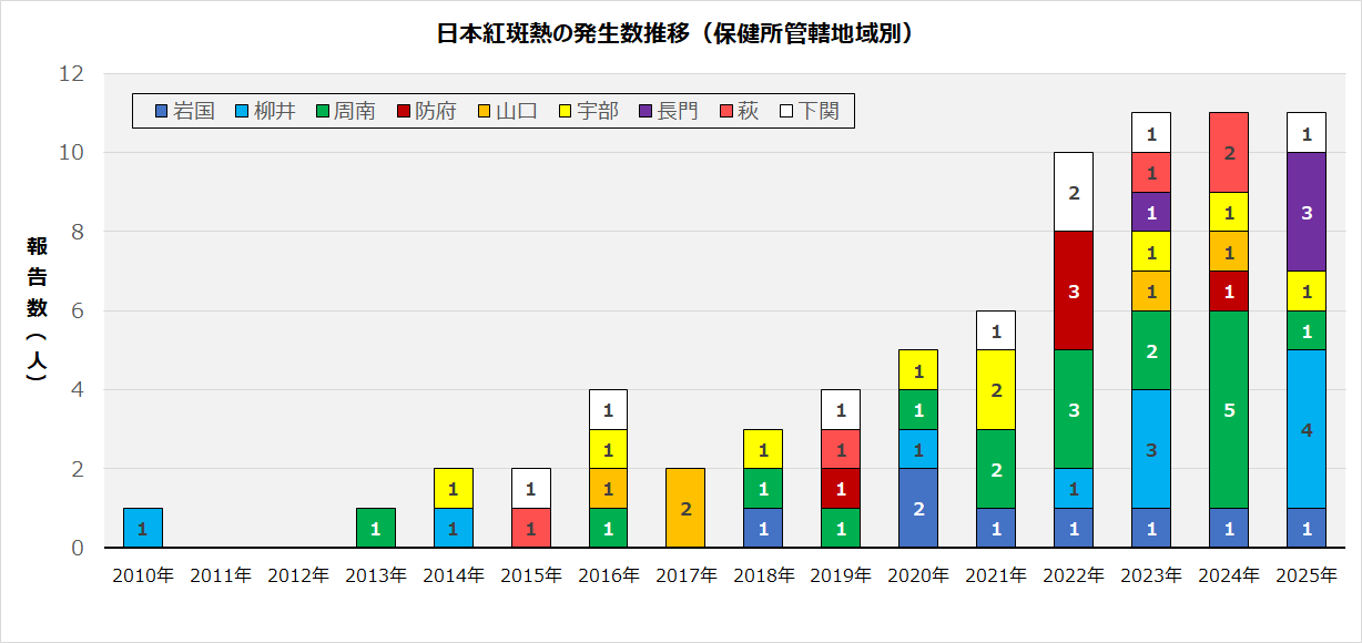国内においては1984年に初めて患者が報告され、日本紅斑熱と呼ばれるようになりました。山口県では2010年6月25日に初めて患者が報告されました。