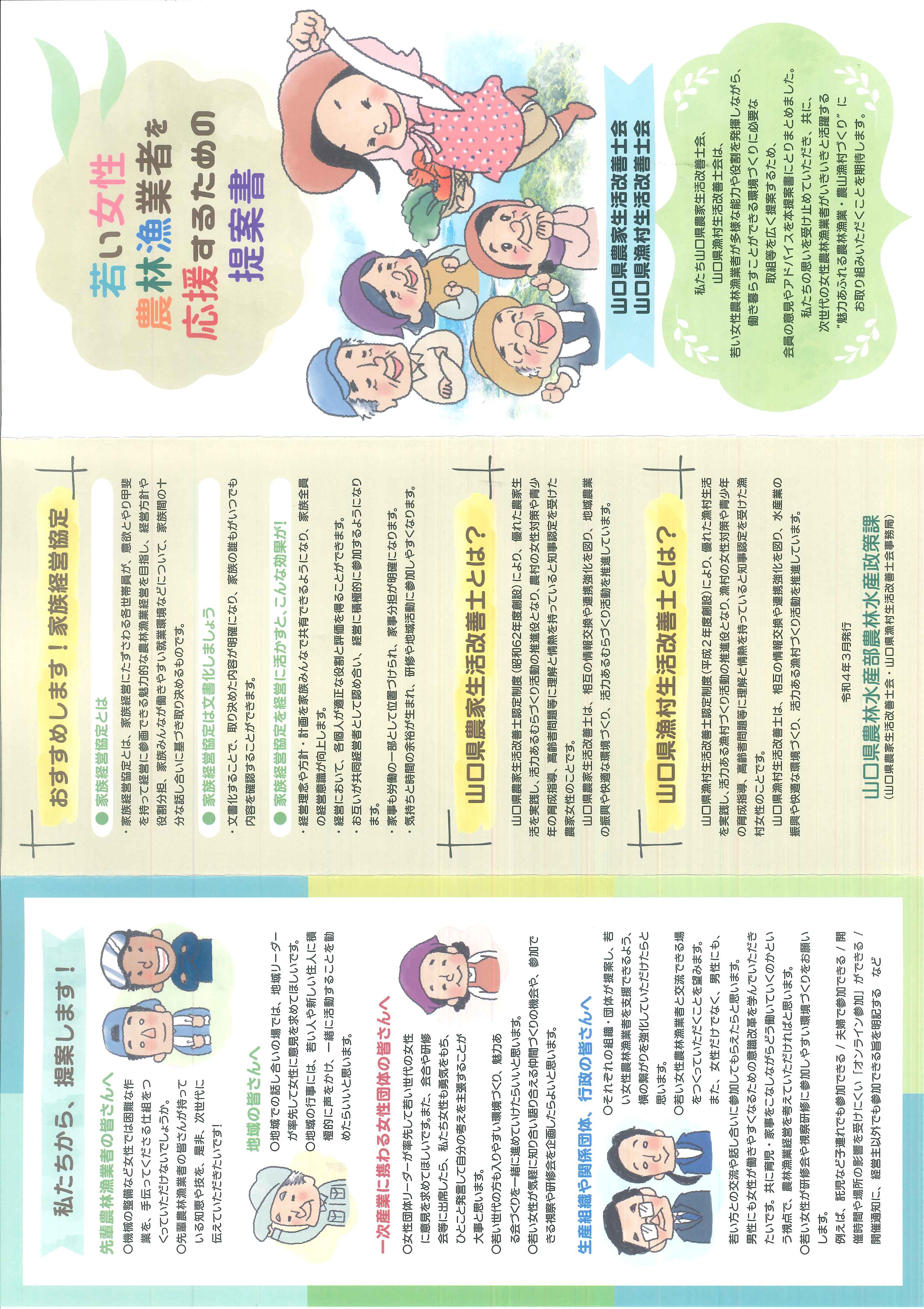 令和3年度に、山口県漁村生活改善士会と合同で作成した、「若い女性農林漁業者を応援するための提案書」を活用し、次世代の若い農林漁業者がいきいきと活躍することができる環境づくりに取り組んでいます。また、地域での実践活動に活かせるよう、山口県農業士協会や新規就農サポーターズとの連携を進めています。