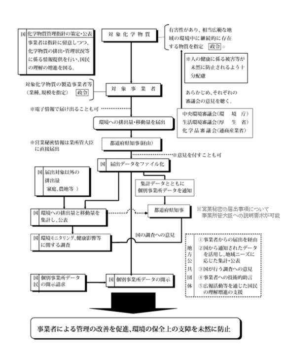 届出データを化学物質の種類別、業種別、都道府県別などに集計して公表。あわせて、届出対象外の事業所や家庭・農地・自動車等からの排出量を推計して公表なお、個別事業所ごとのデータは、国に請求すれば電子ファイル化された情報を有償で入手可能
