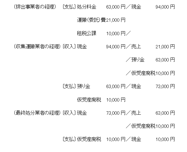 排出事業者が、収集運搬業者に産業廃棄物10トンの収集運搬を委託して最終処分場に持ち込むとともに、現金で収集運搬料金等を全て収集運搬業者へ支払い、最終処分業者には県に産業廃棄物税を現金で納入した場合。